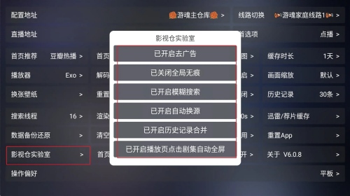 整体设置和 TVBox 非常相似,这里主要说下影视仓实验室和弹幕。如图,都是字面意思,就不过多介绍了