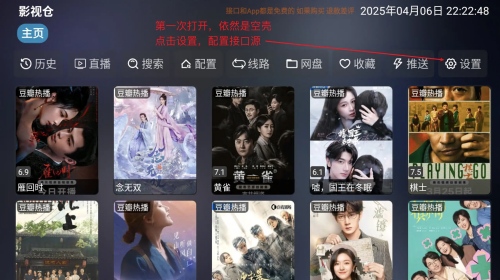 1.确保在电视上已经安装好影视仓TV版,打开应用如图操作,首次打开首页应该是空白的,没有任何资源。