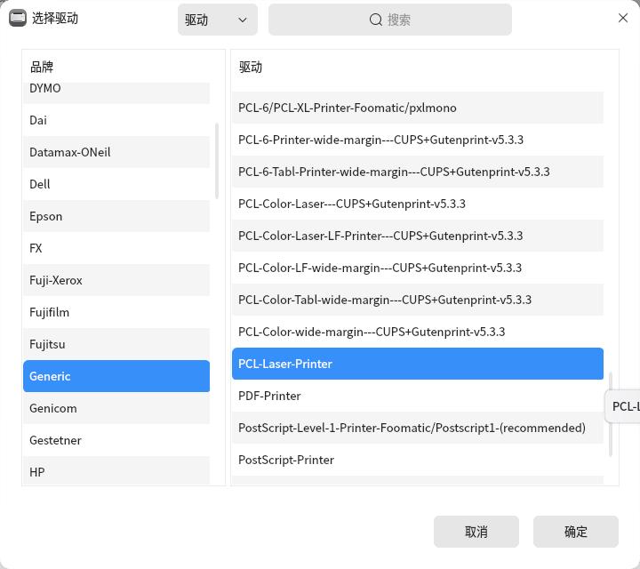 左侧品牌列表中,选择Generic,右侧驱动列表中,选择PCL-Laser-Printer。